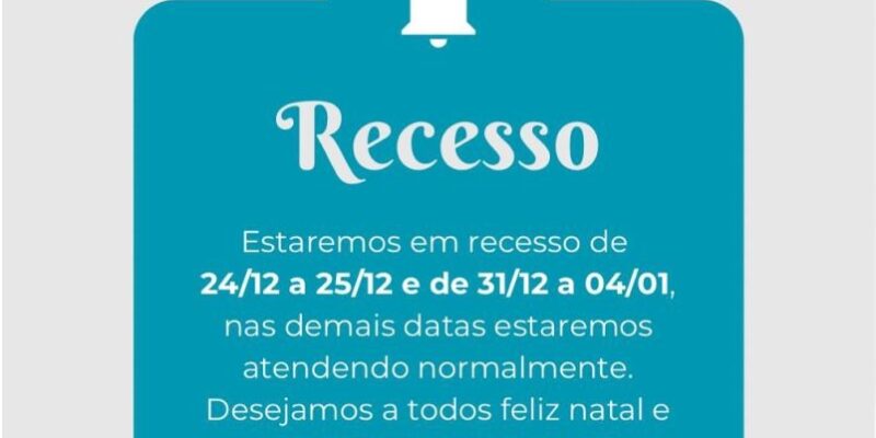 Estaremos em recesso de 24/12 a 25/12 e de 31/12 a 04/01, nas demais datas estaremos atendendo normalmente.